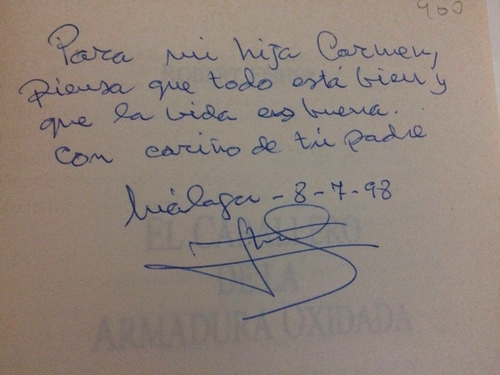 Te extraño y el único consuelo que me queda es el de una dedicatoria que me ofreciste allá por el año 98 en uno de los mil y un libros que me regalaste y que decía… «Para mi hija Carmen, piensa que todo está bien y que la vida es buena… Con cariño de tu padre»